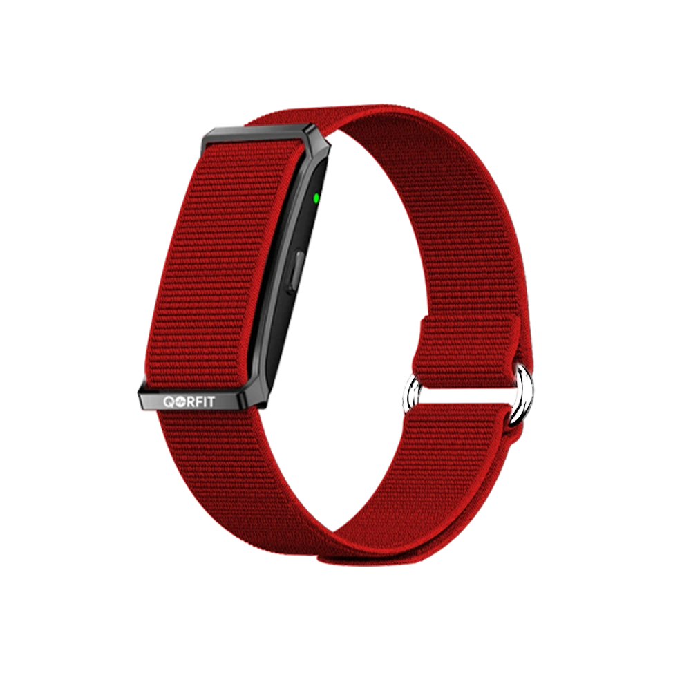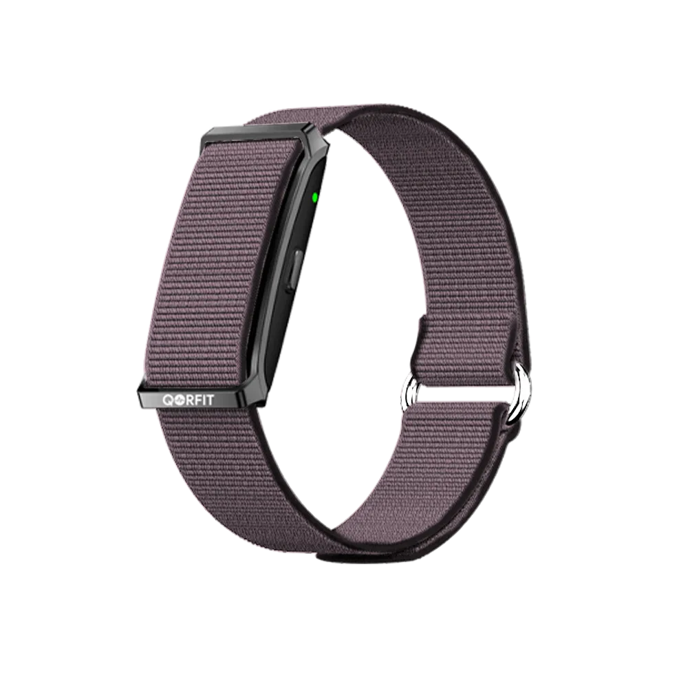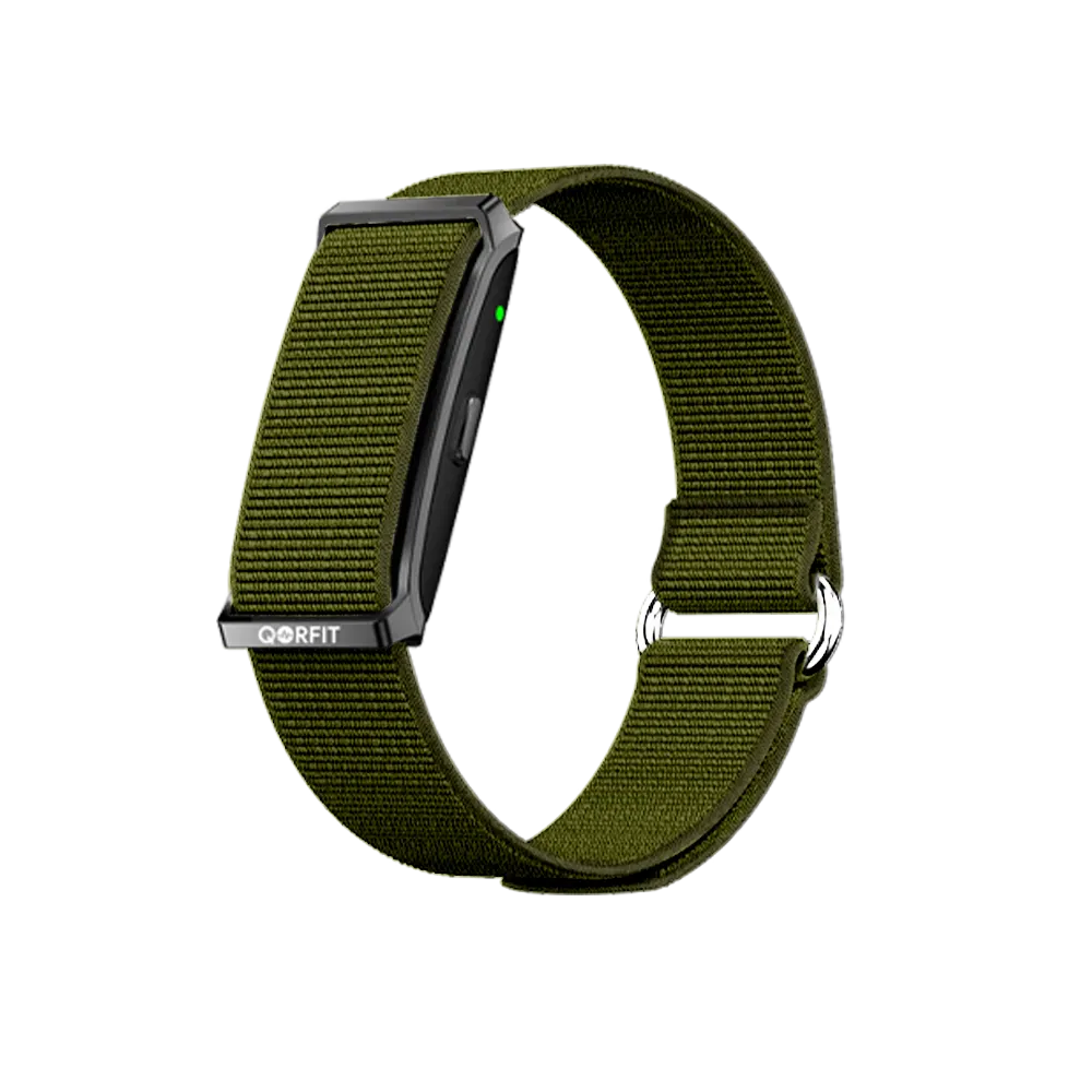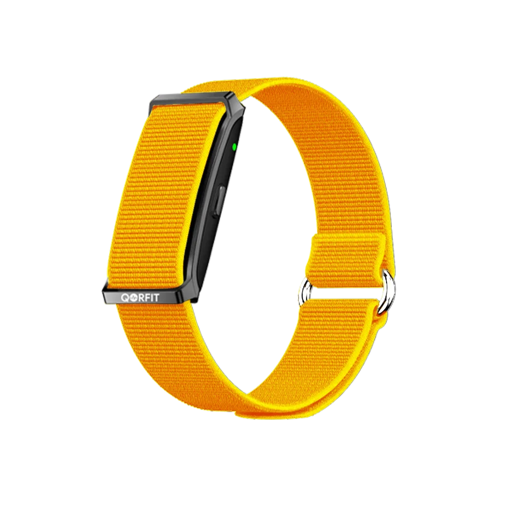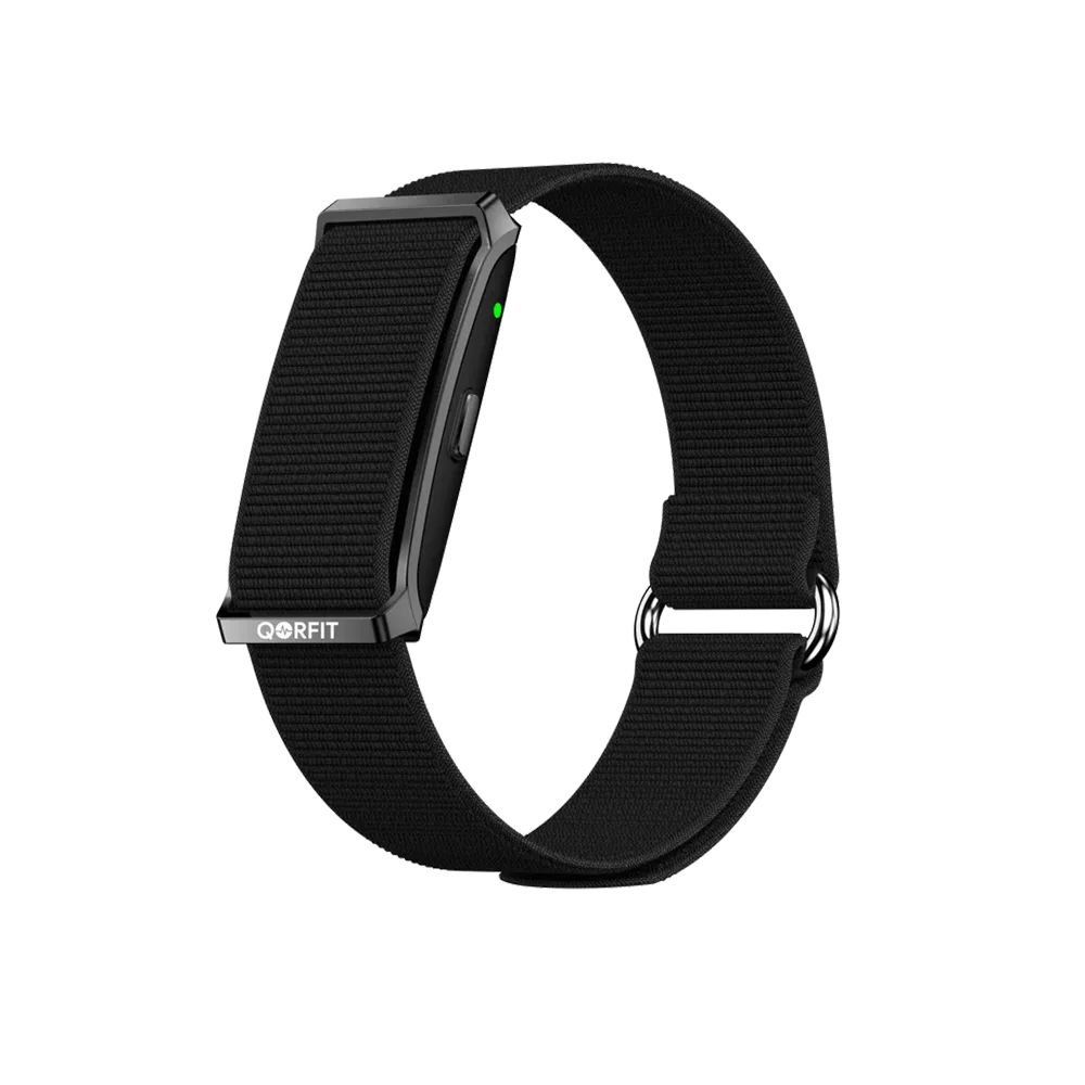 Two bands are included with the Qorfit Pulse: one black nylon and one black silicone. Colour bands are sold separately in packs of 5, available in two types — EVERYDAY CORE and VIBE CORE.