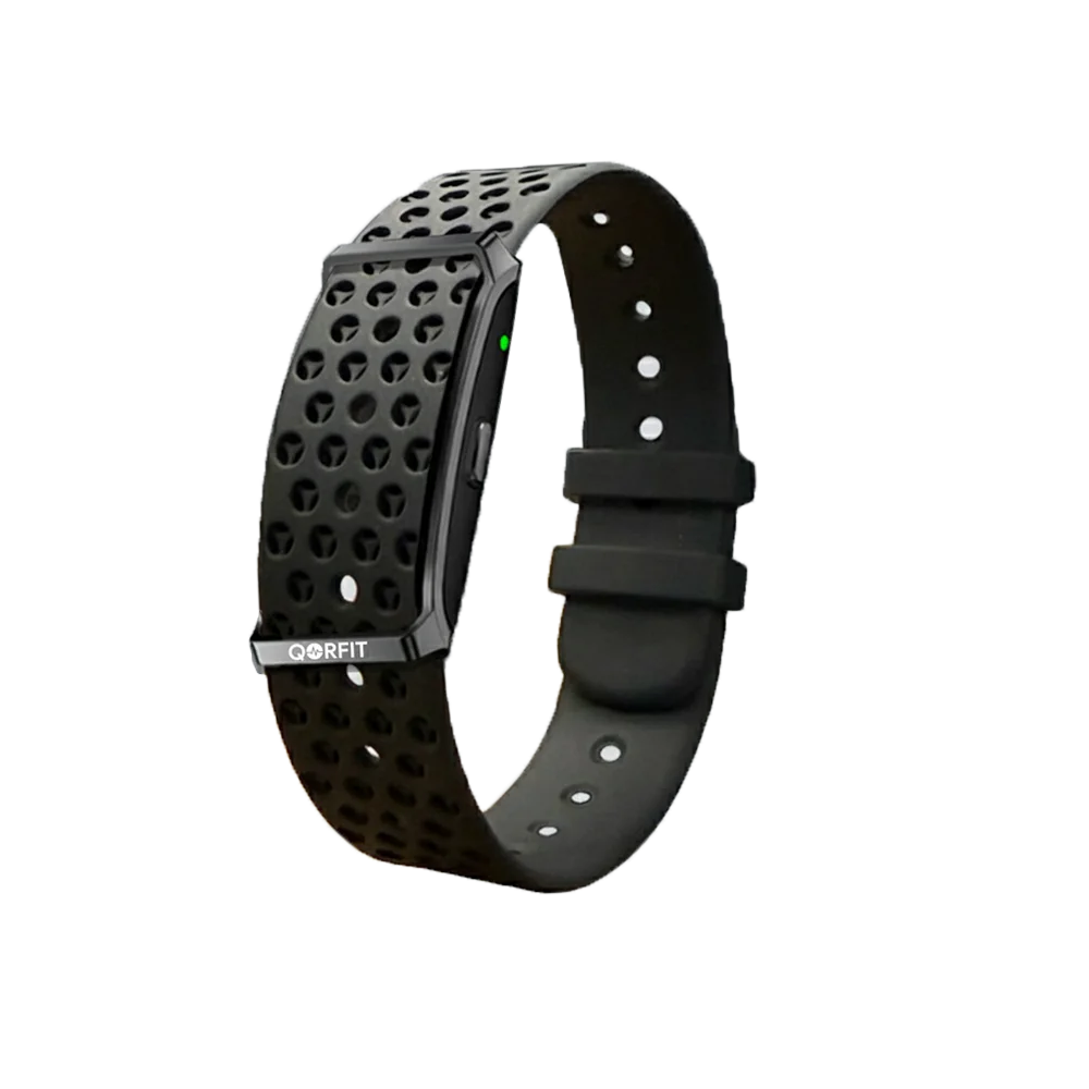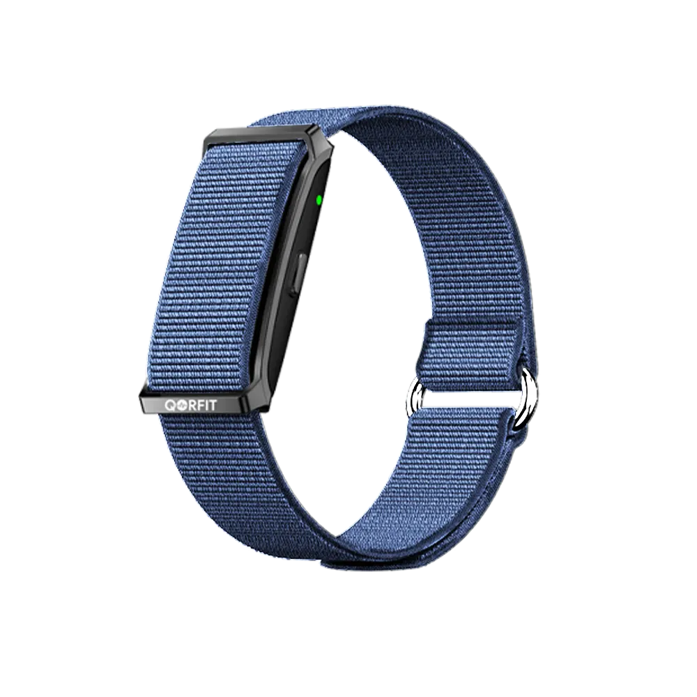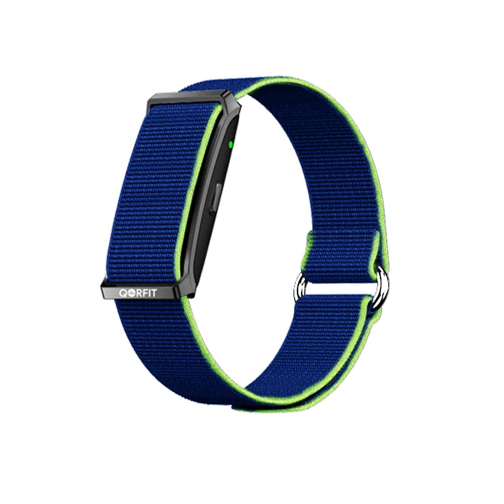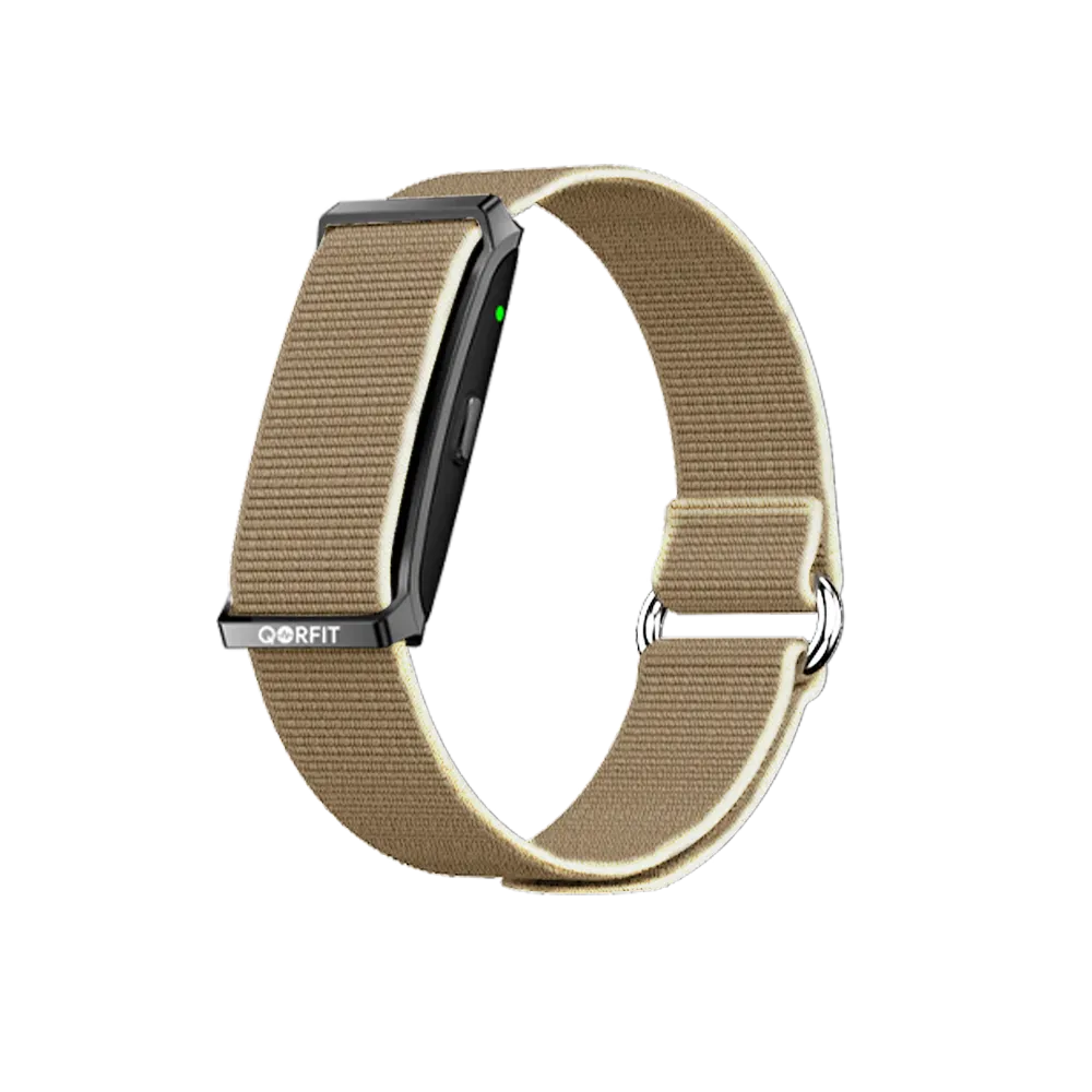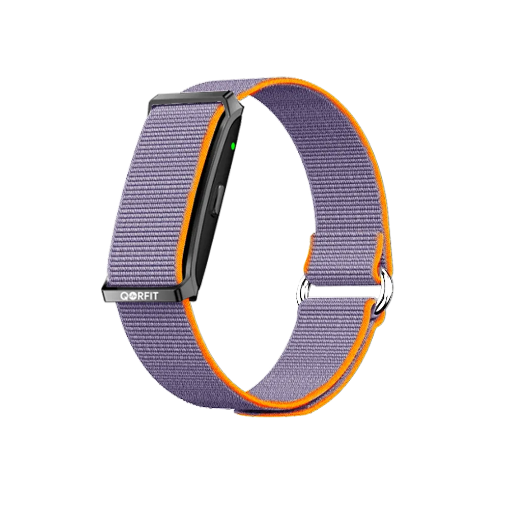 Two bands are included with the Qorfit Pulse: one black nylon and one black silicone. Colour bands are sold separately in packs of 5, available in two types — EVERYDAY CORE and VIBE CORE.