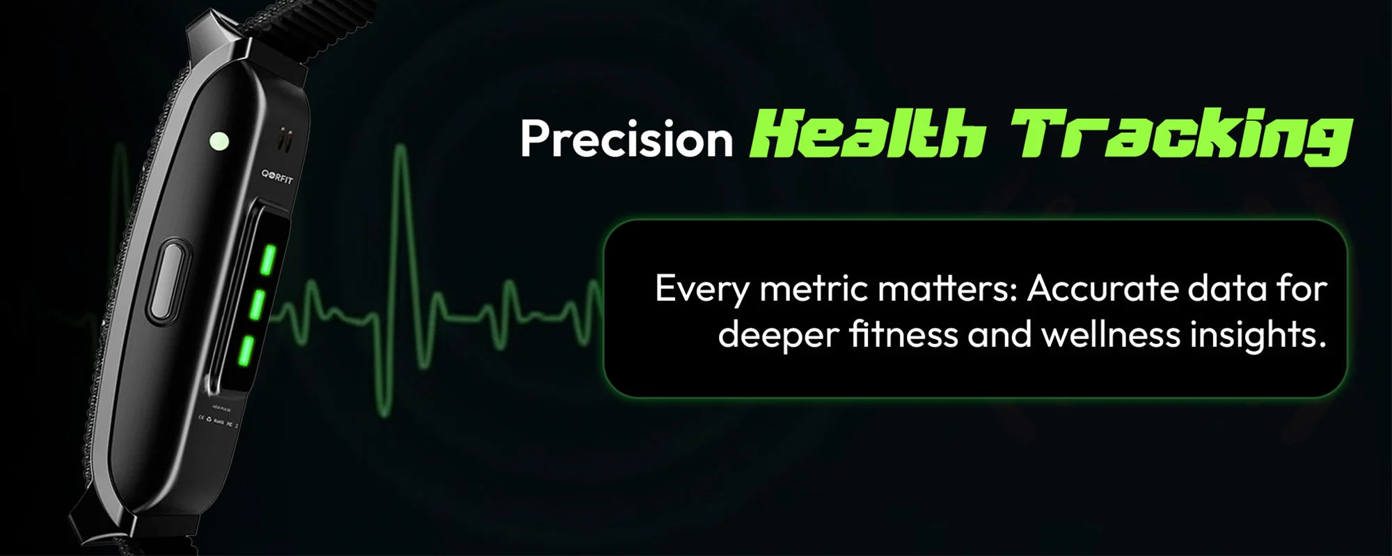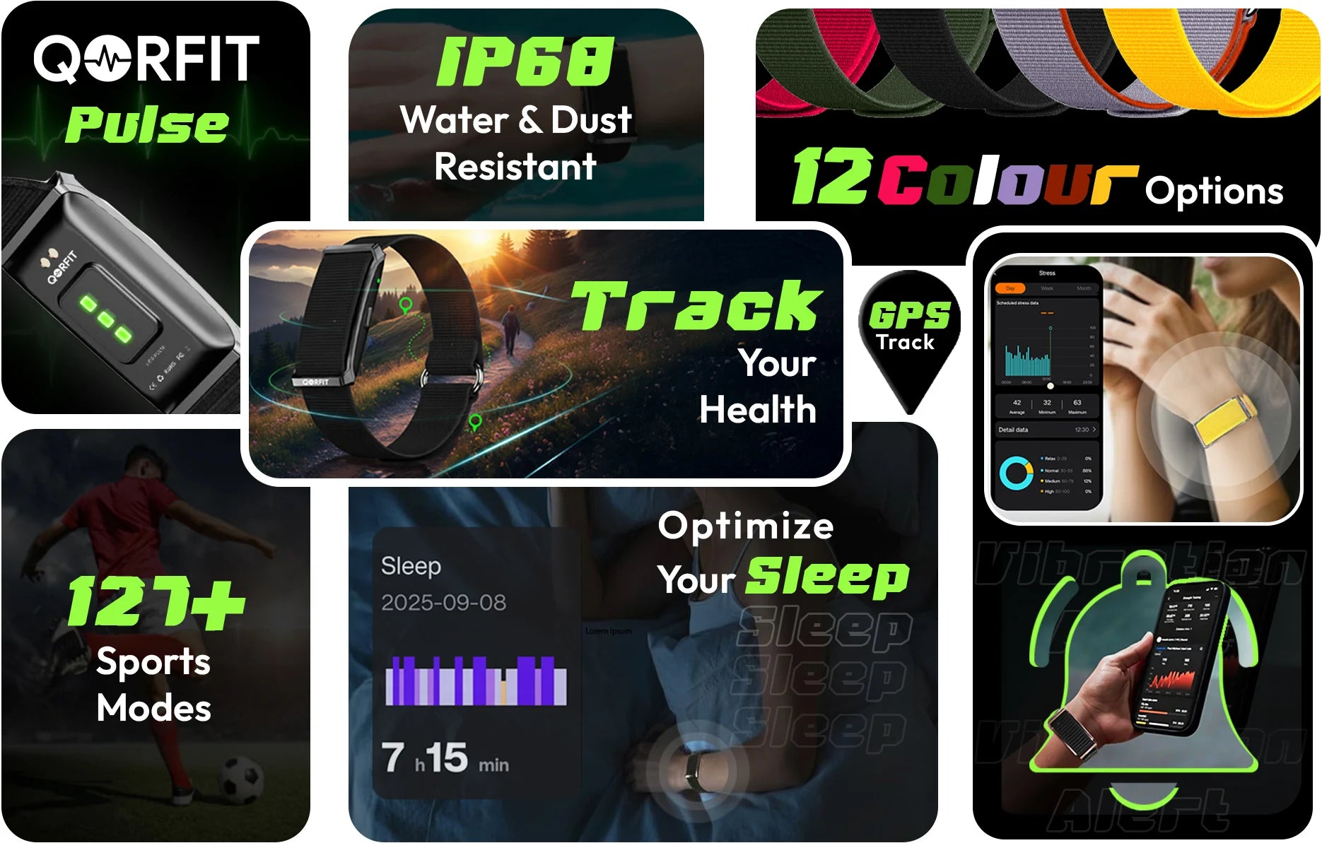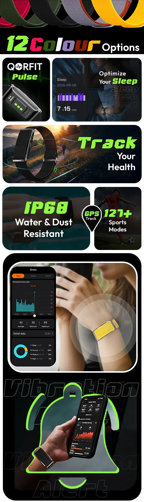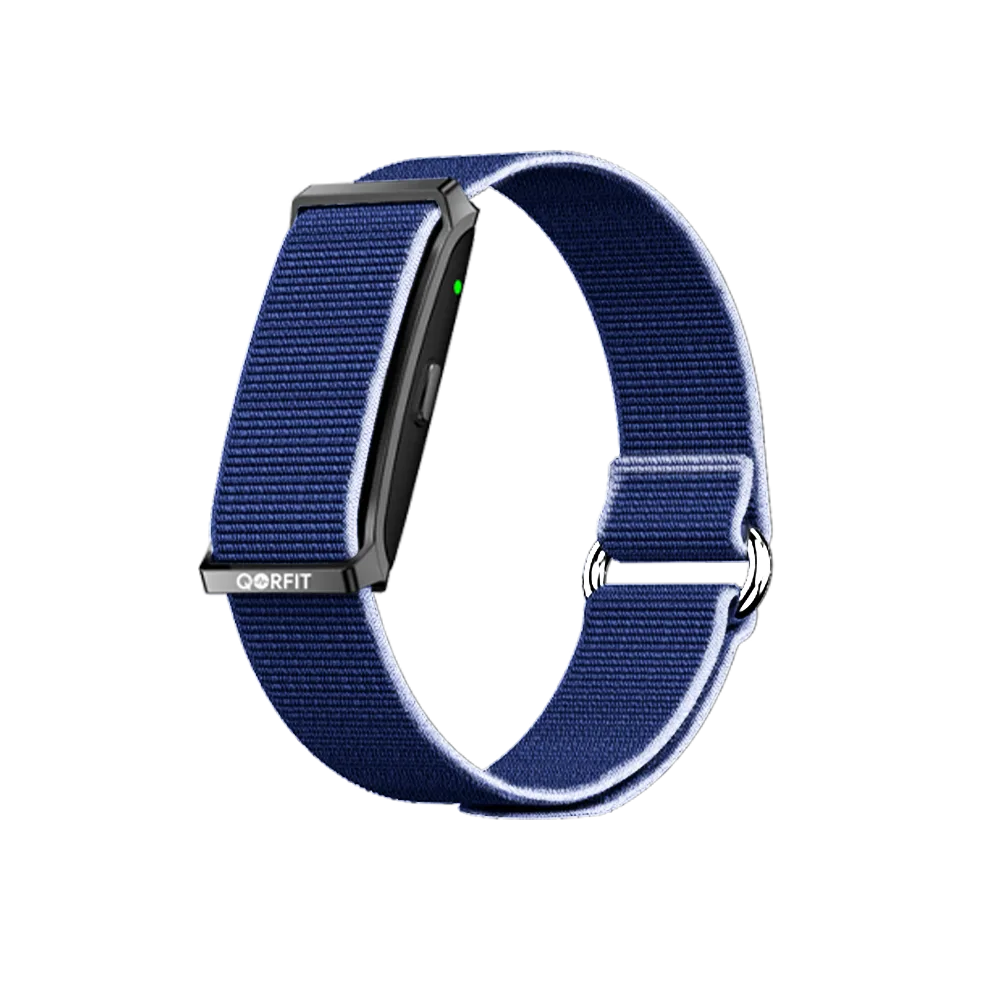 Two bands are included with the Qorfit Pulse: one black nylon and one black silicone. Colour bands are sold separately in packs of 5, available in two types — EVERYDAY CORE and VIBE CORE.